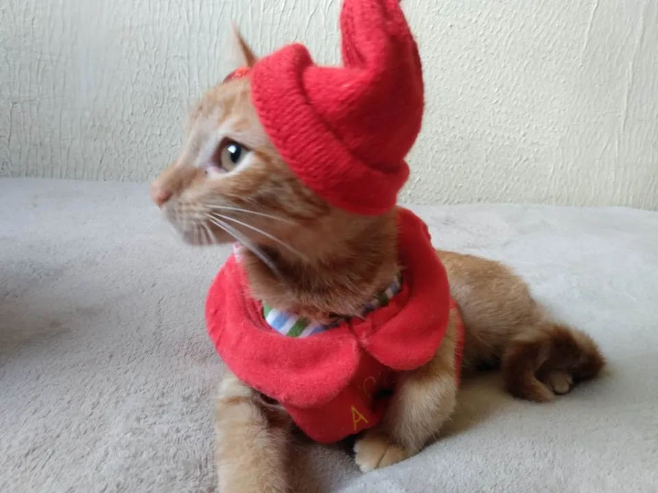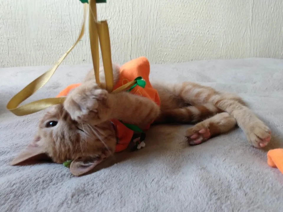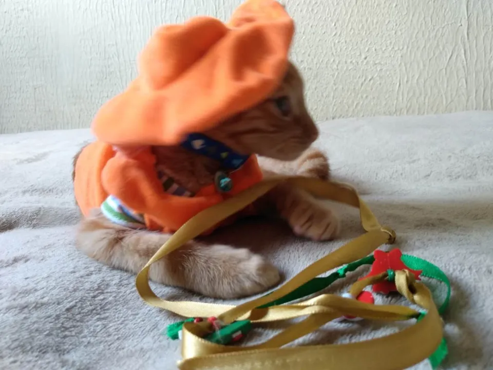 Características Físicas: machinho, cerca de 120 dias de vida; pelagem densa e abundante da categoria Orange Ticked Tabby (diferente tons de laranja/dourado ao longo do comprimento dos pelos; presença de desenho em forma de "M" na testa e de marcações circulares na região interna do abdome e listras em toda a extensão da calda, destacadas em tonalidade mais escura - fulva); olhos verde alaranjados (âmbar); trufa rosada.