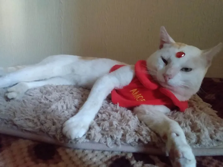 Características Físicas: machinho, cerca de 6 meses de vida; pelagem curtinha, densa e bem assentada, da categoria Sólida (branca) com marcações Orange Ticked Tabby (em tom dourado, listras ao longo do comprimento da cauda e bolinhas na região do dorso e da cabeça); trufa rosada; olhos redondinhos, de coloração verde água.