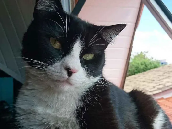 Pelagem preta nas costas, branca na barriga e nas patinhas, nariz preto e rosa, olhos amarelo, gordo e dócil. Atende pelo nome Musashi, foi visto pela última vez no bairro boneca do iguaçu próximo ao mercado renata.
