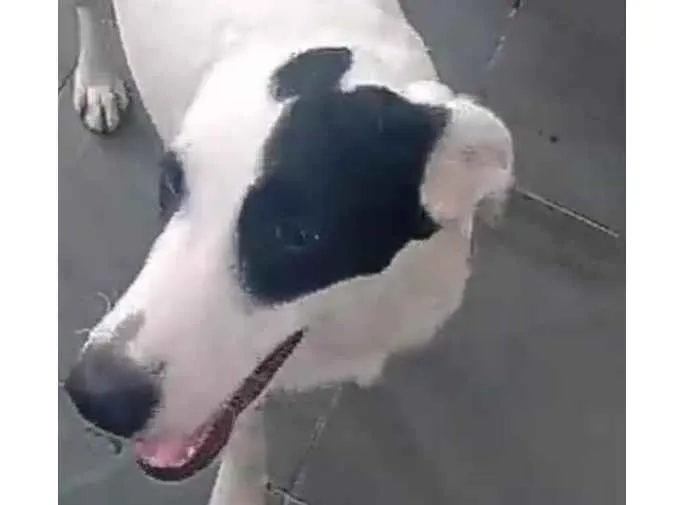 Meu cão e branco porte médio,dócil mas muito agitado,tem uma mancha parecida com uma gota preta nas costas e no lado esquerdo do olho muito brincalhão olhos escuros porte bonito
