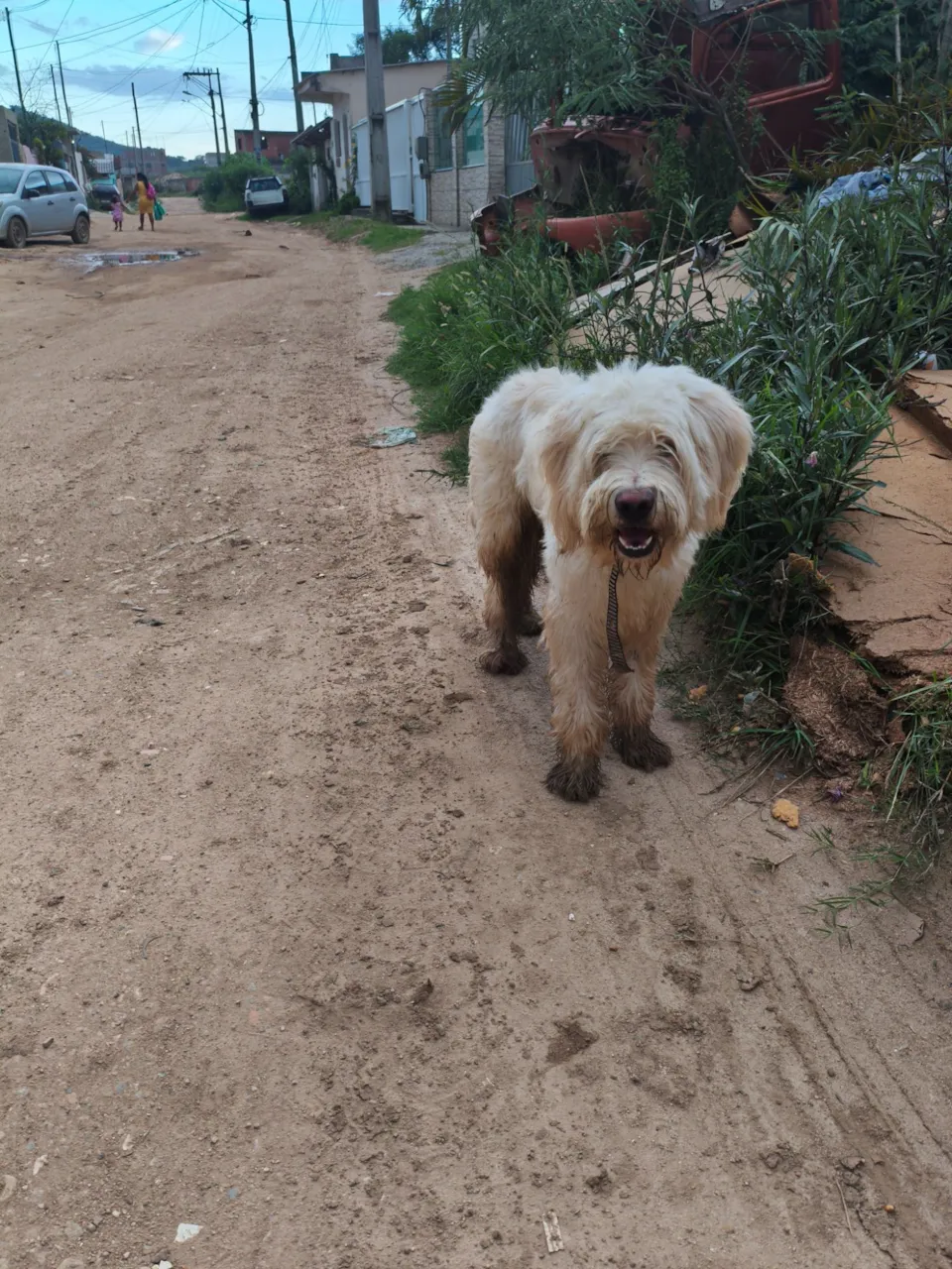 Encontrei uma cadela fêmea de raça SRD (vira-lata), com pelagem branca. Ela aparenta ter entre 2 a 6 meses de idade e é de porte grande. A cadela está perto da minha casa e está com uma coleira, o que indica que pode ter se perdido de sua família. S