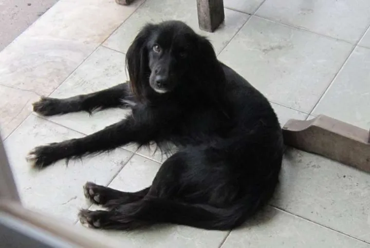 Preta, pare uma mistura de cookie spain com algo mais. Pelagem lisa, extremidades das orelhas avermelhadas. Leve manchinha branca no peito e entre os dedos dos pé. O corpo tem um pelo mais curto, e As orelhas e o rabo com pelos mais comprido.