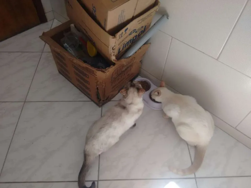 As gatas são duas, uma ( branca com amarelo na patas e calda é castrada, e se chama Madona) a outra é (branca com mechas pretas no rosto e corpo, essa não é castrada, e se chama Ritinha) ambas são mansas e caseiras e vacinadas, comem ração e comida também, faz as necessidades na caixa de areia, adoram dormir dentro de caixas de papelão, adoram brincar, motivo da doação mudança, o local não aceita animais e é muito pequeno.