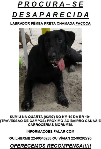 SUMIU NA QUARTA (03/07) NO KM 10 DA BR 101 (TRAVESSÃO DE CAMPOS) PRÓXIMO AO BAIRRO CANAÃ E CARROCERIAS MORUMBI. INFORMAÇÕES FALAR COM GUILHERME 22-99046238 OU VÍVIAN 22-99282795 OFERECEMOS RECOMPENSA!!!!!