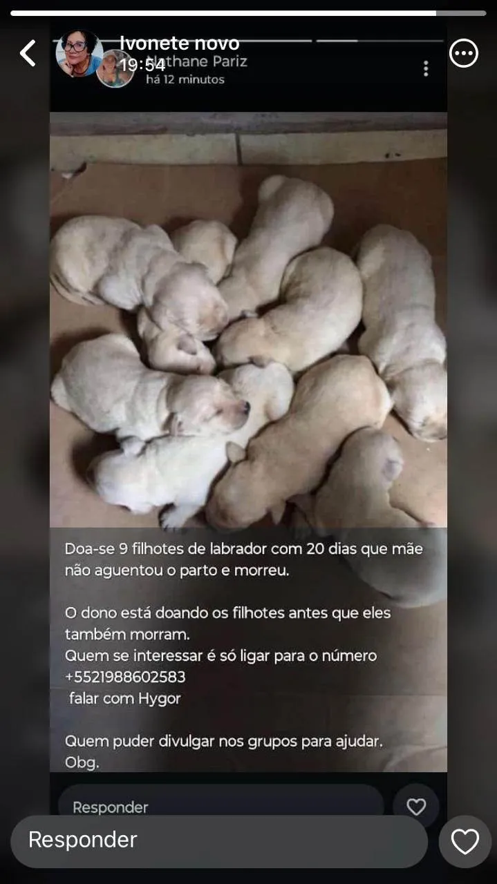 Compartilho adoção responsável de 09 filhotes de labrador, a mãe morreu quando eles estavam com 20 dias. Eles precisam de mamadeira de leite adequado para filhotes.