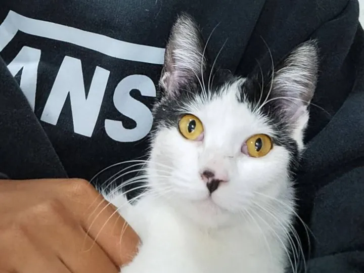 Estamos doando a nossa querida Felicia, uma adorável gata SRD-ViraLata com pelagem branca e preta. Ela tem aproximadamente 1 ano e é de porte pequeno. Felicia é uma companheira incrível, com um temperamento dócil, calmo, brincalhão e carente. Ela ama interação e é extremamente sociável, dando-se bem tanto com crianças quanto com outros gatos, além de ser amigável com desconhecidos.