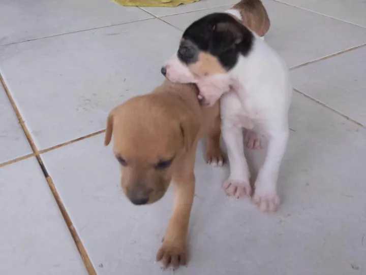 Filhote com menos de 1 mes. Curiosa, gosta de carinho, adora brincar entre os irmãos. De vez em quando late e já está aprendendo a correr.