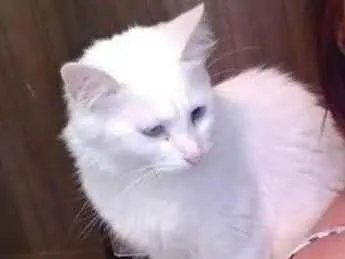 Gata com olhos azuis ,peluda , podendo estar magrinha agora e sujinha . Atende por Branca