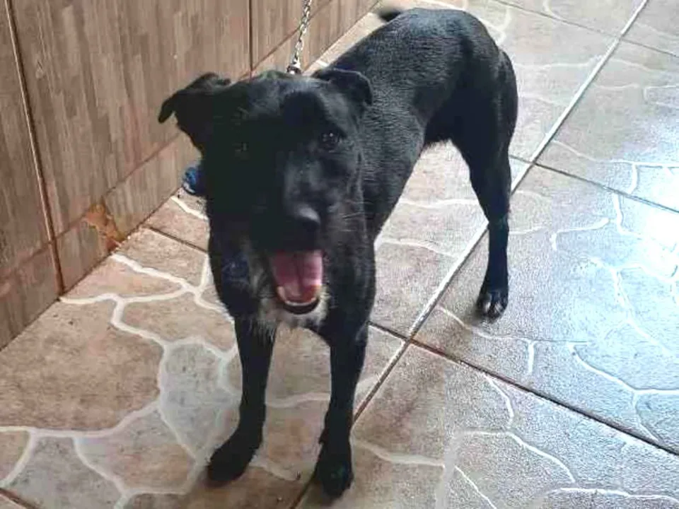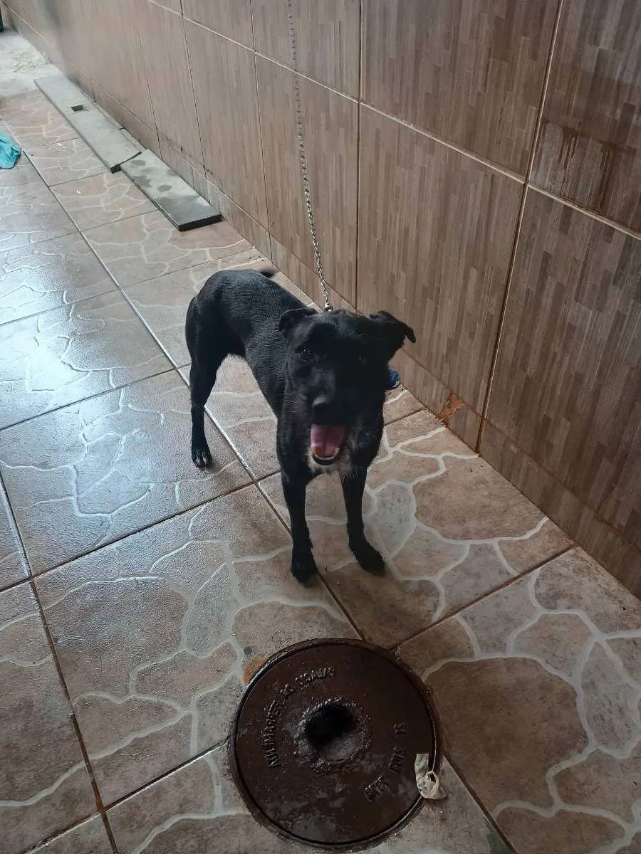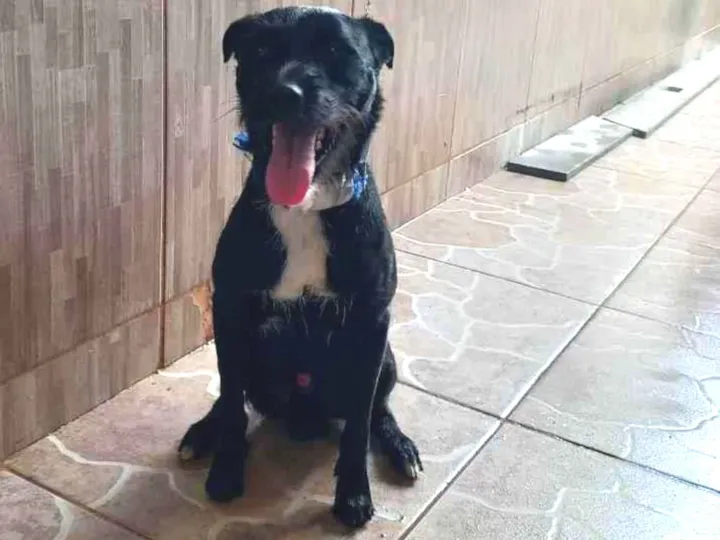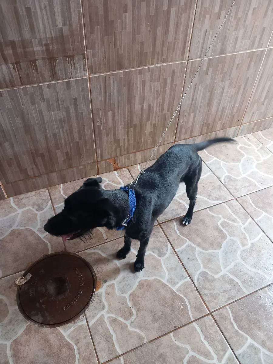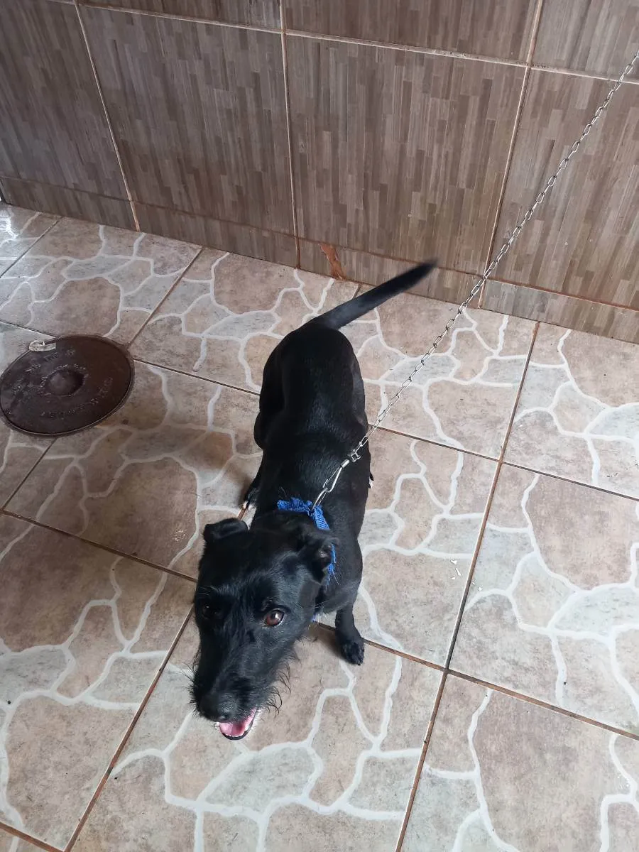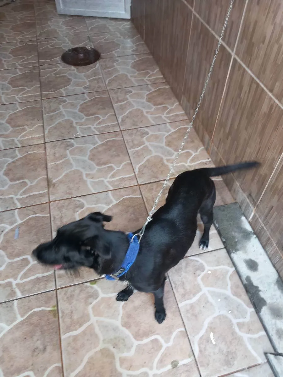 Pelo preto, com uma mancha branca abaixo do corpo e pintas nas patas, minha filha pegou na rua, mas já tenho uma cachorra e essa é muito ciumenta, briga com qualquer animal que chega. Está difícil há 2 anos, preciso me virar nos 30, para não se machucarem.