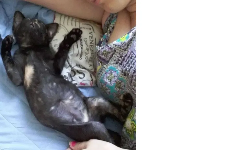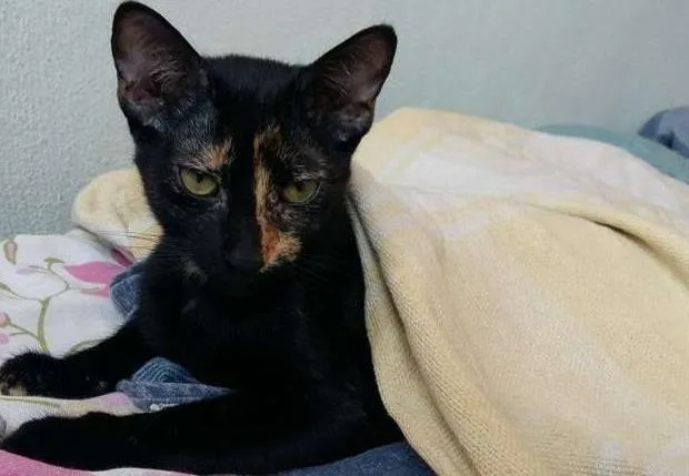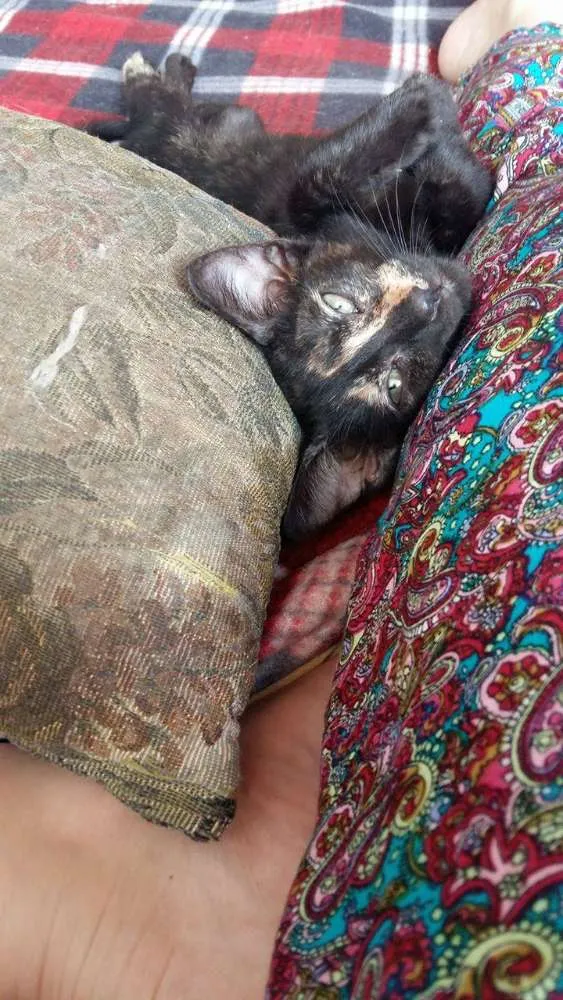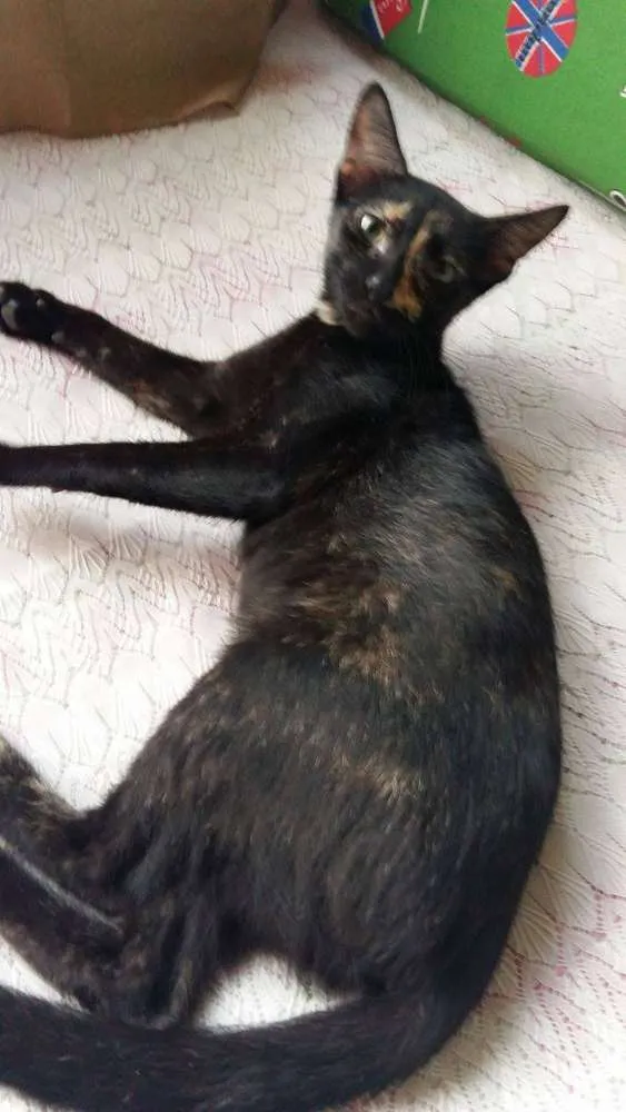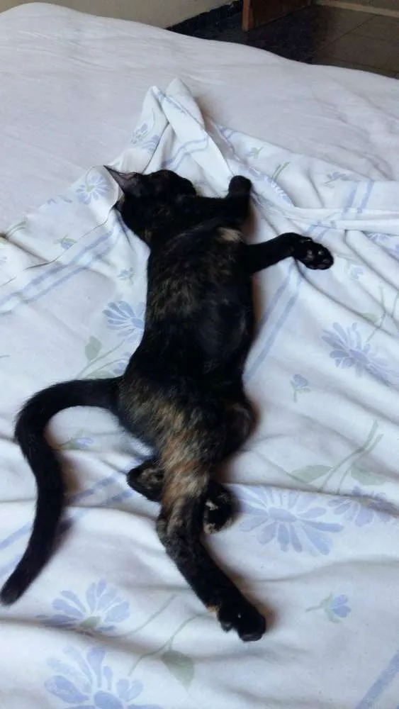 Ela tem por volta de 5 meses e fugiu poucos dias antes de sua castração, com isso não consegui realizar. Ela é preta com manchas amarelas, mais marcantes na parte de baixo da barriga e no rosto. É muitíssimo assustada, porém muita carinhosa e chorosa.