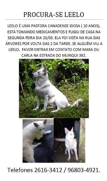 LEELO É UMA PASTORA CANADENSE IDOSA ( 10 ANOS), ESTÁ TOMANDO MEDICAMENTOS E FUGIU DE CASA NA SEGUNDA FEIRA DIA 23/03. ELA FOI VISTA NA RUA DAS ÁRVORES POR VOLTA DAS 2 DA TARDE. SE ALGUÉM VIU A LEELO, FAVOR ENTRAR EM CONTATO COM MARA OU CARLA NA ESTRADA DO MURIQUI 392, VILA PROGRESSO NITERÓI RJ