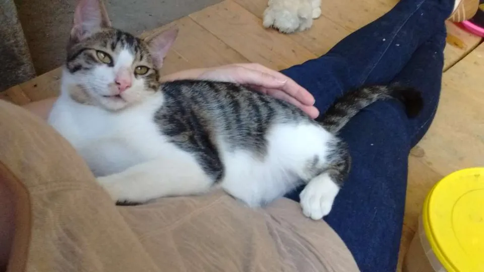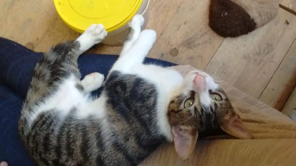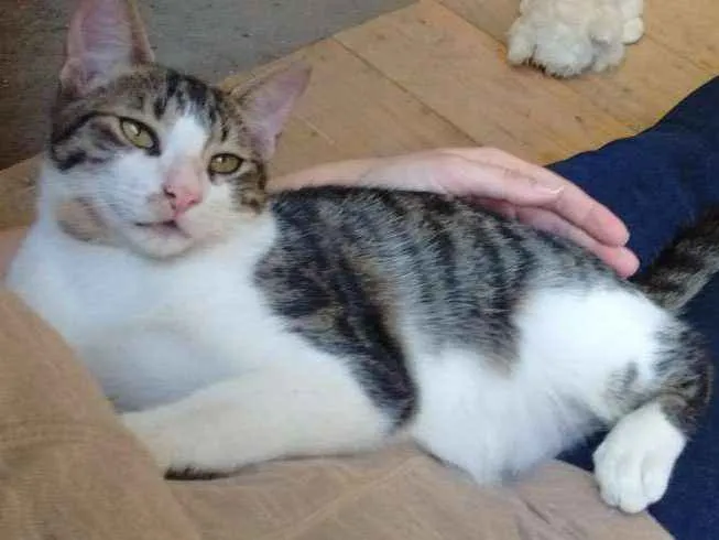 Macho – aprox. 5 meses. Cresceu entre barulhos e então é um pouco desconfiado, mas uma vez que te conhecer é muito amoroso. Aceita bem companha de outros gatos. Gosta de brincar mas ama muito mais o carinho.