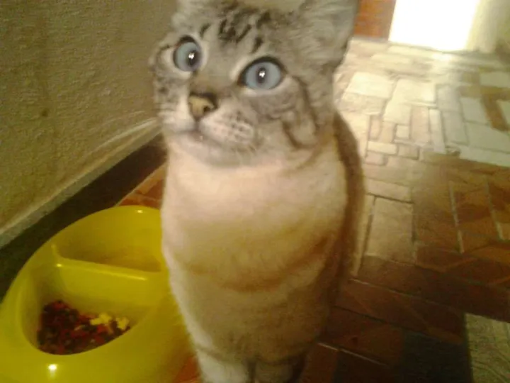 A Mel tem 14 anos, pelagem cinza claro com listras escuras, olhos azuis. O focinho já está esbranquiçado.
