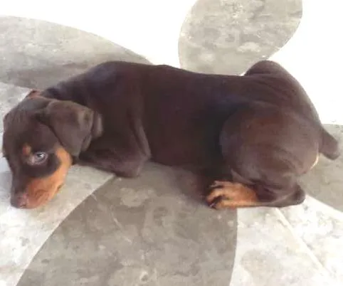 Meu marido me deu, mas não posso ficar com ele e as pessoas de quem o meu marido comprou não querem aceita-lo de volta. Estou com problemas de saúde, além de trabalhar e com um filho de 1 ano e não terei muito tempo para dar atenção e o devido carinho ao cachorro. Ele é lindo, um filhote de 2 meses vermifugado e com a primeira dose da vacina, é um Doberman Alemão da cor chocolate. Só peço de volta o valor que meu marido pagou por ele e uma família que saiba amá-lo.