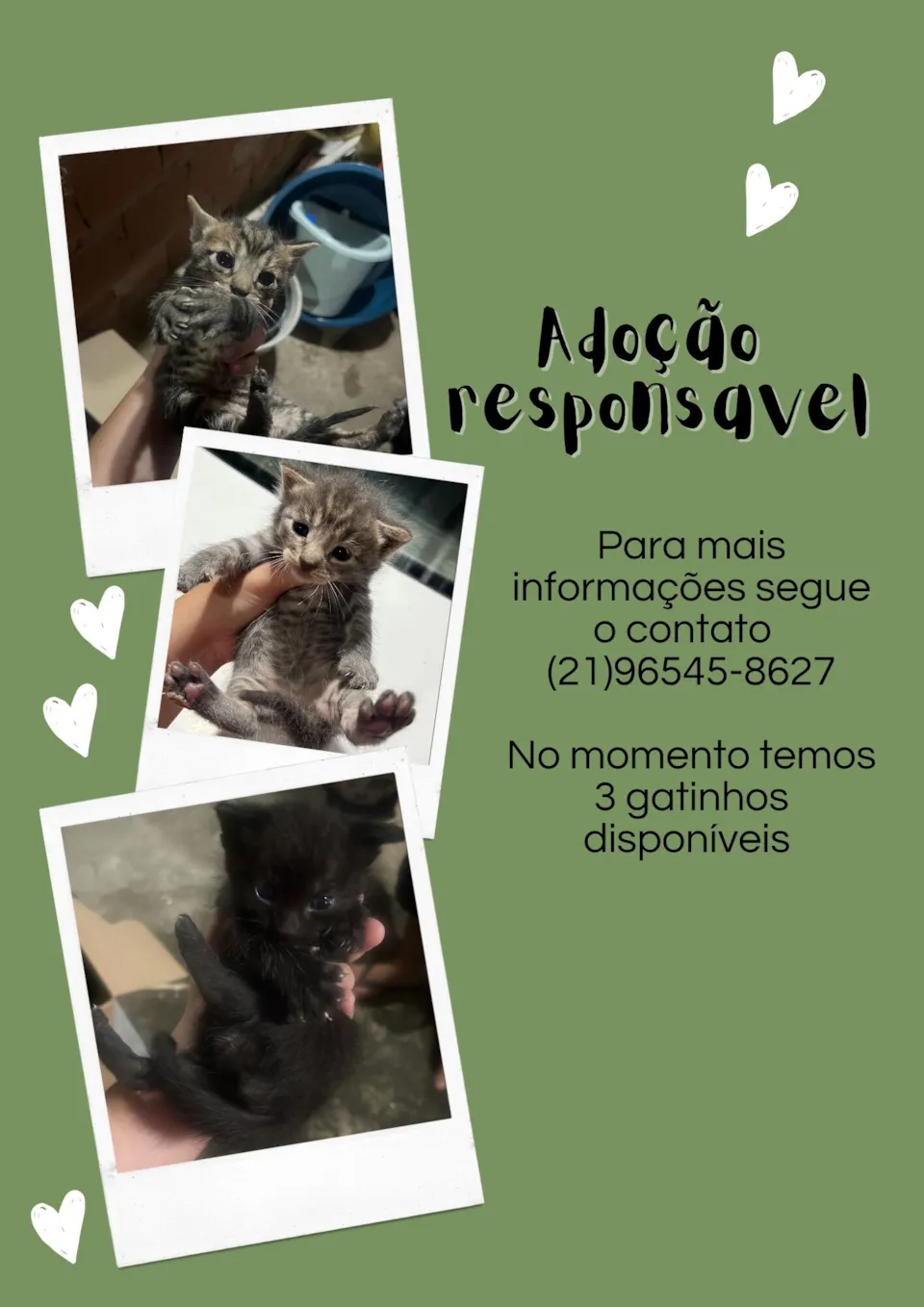 Peço, por favor, que entrem em contato apenas se realmente tiverem interesse e condições de cuidar direitinho. Adoção é um ato de amor e compromisso 🏡✨