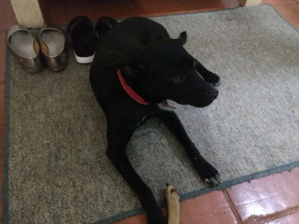Ela é uma cachorra muito feliz e dócil, te escuta chegar de longe e sempre vem na porta te receber. Ela para o pescoço para colocar a coleira e anda na corrente super tranquila.