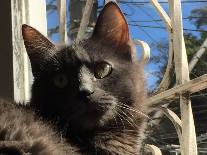 Gatinha de porte médio, pelo grande de cor cinza e olhos verdes.