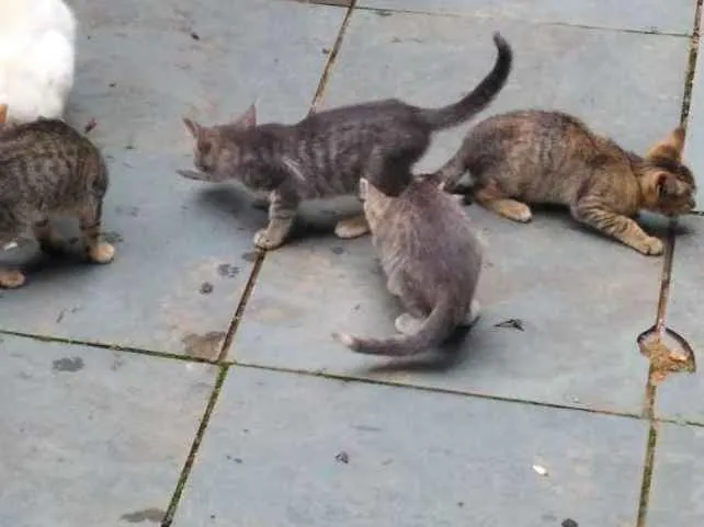 Apareceu uma gata no meu trabalho tem uns dois meses, muito magra branca de olhos azuis, fiquei alimentando ela,e hj ela trouxe 4 filhotes fêmeas. Meu patrão falou p sumir com eles daqui. Me ajudem!