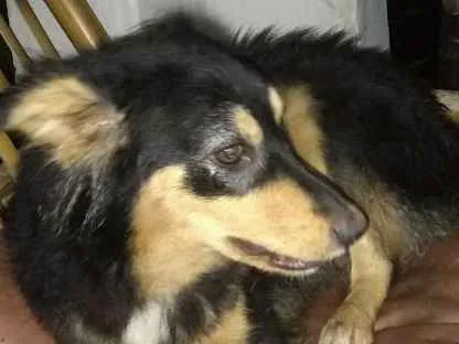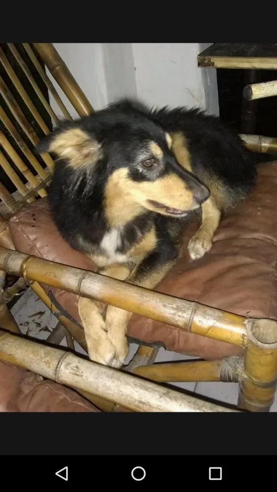 Gaia é mistura com border collie, possui pelagem preta, branca e marrom.