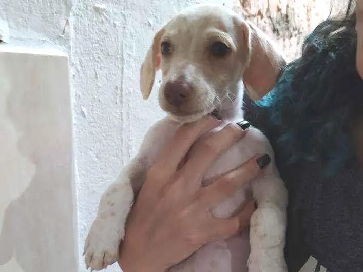Aparenta ter menos de um mês, é macho e ama cafuné. É mistura de basset, pois tem um corpo alongado.