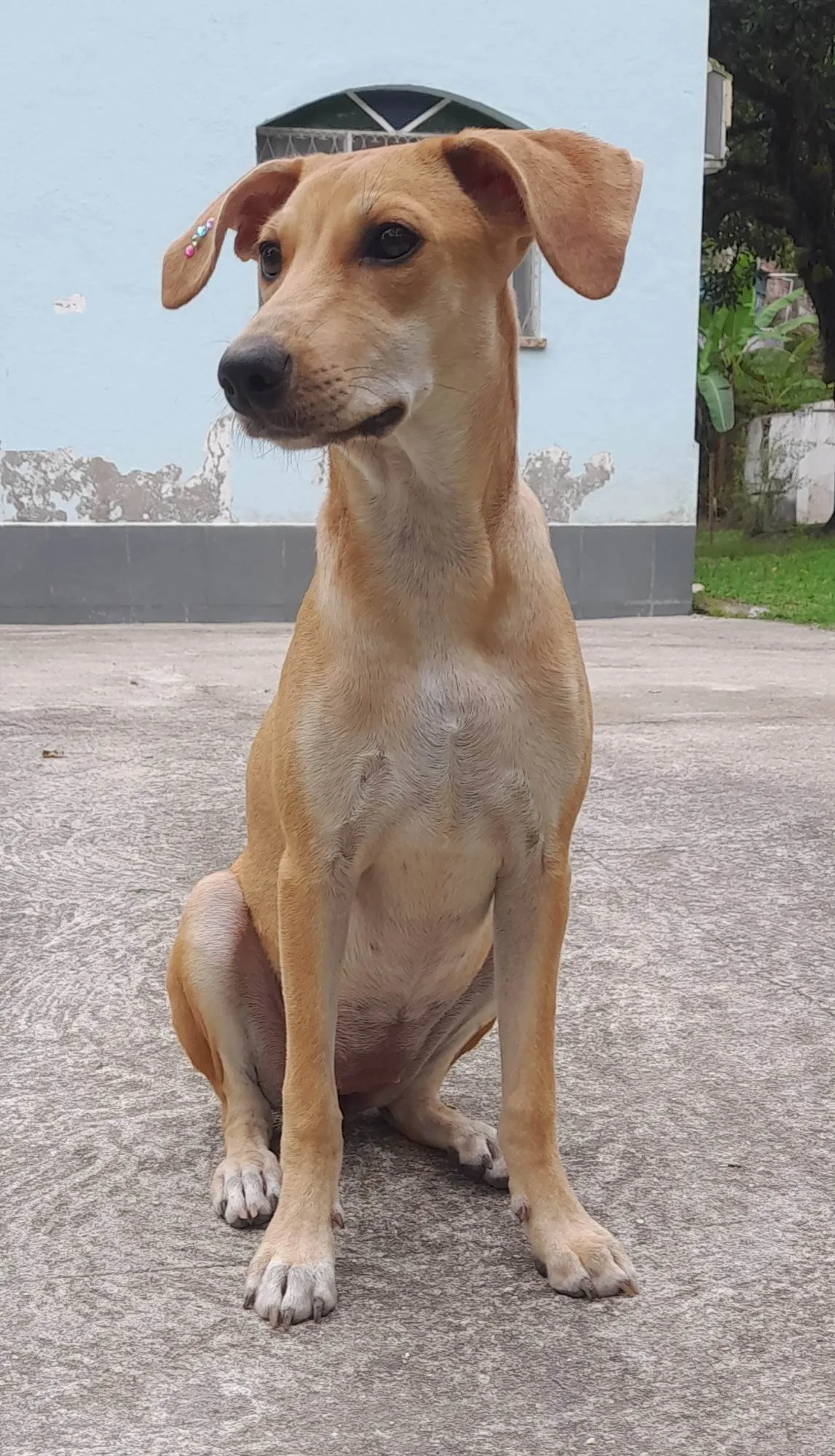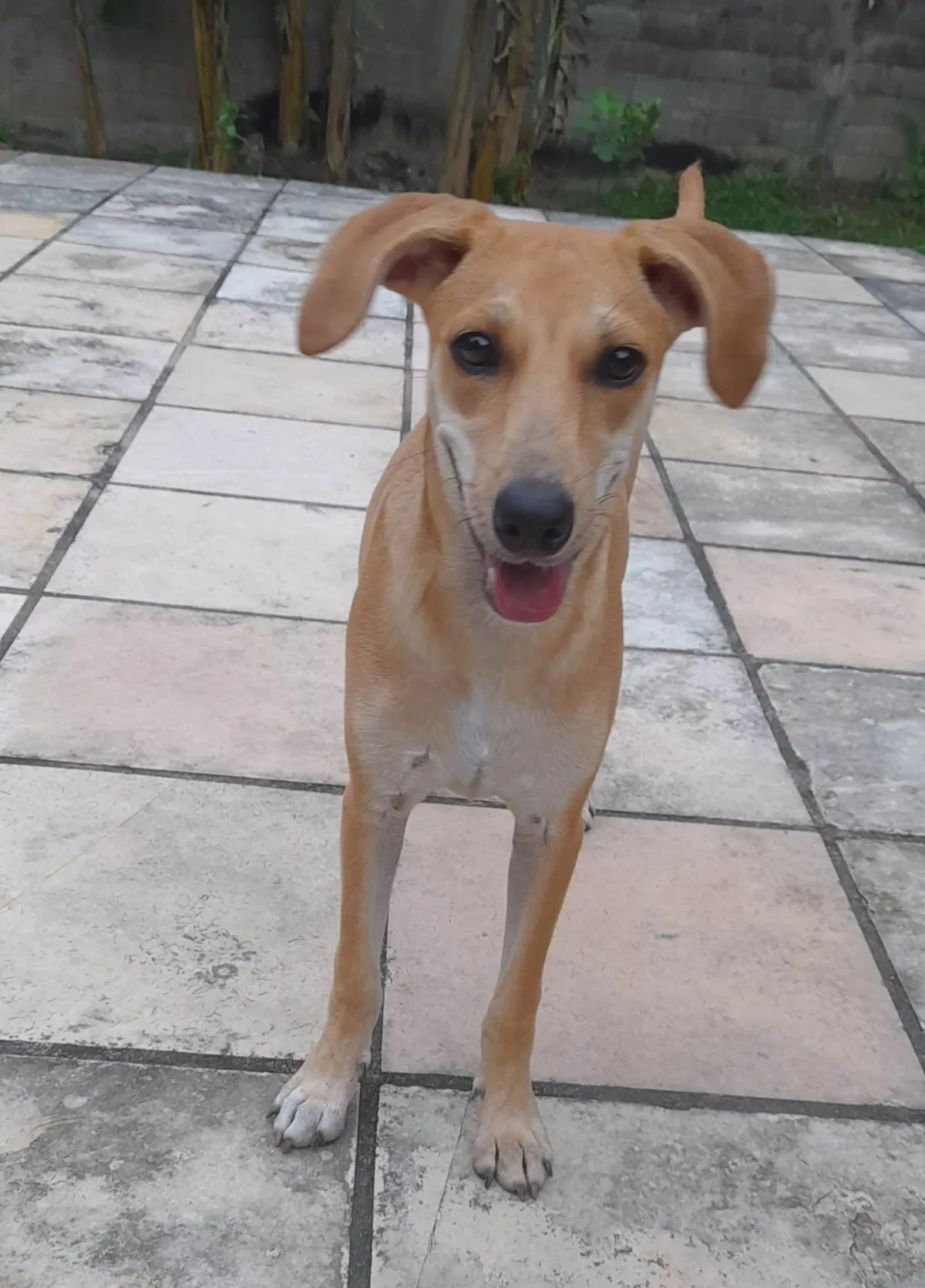 Essa linda pequenina se chama Mel. Ela está com 7 meses, está vermifugada, castrada, tomou a primeira dose da vacina e ficará porte médio.