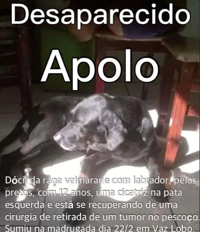 Allan-972877229 -30134357.Deve estar apavorado pois nunca foi na rua sozinho,tem medo de chuva,raios e fogos.A raça dele é vaimarase com Labrador.Eu sou irmã da dona Nely,que é dona dele.Obrigada.