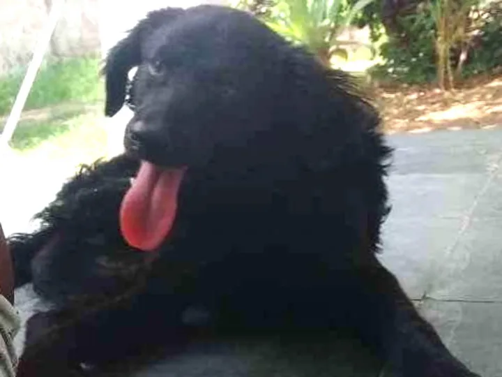 Ele é preto , brincalhão , Estávamos passeando , mas ele muito novo ia atrás de todo mundo , quando eu me virei não estava mas atrás de mim . Perto da Reta da Base em Santa Cruz