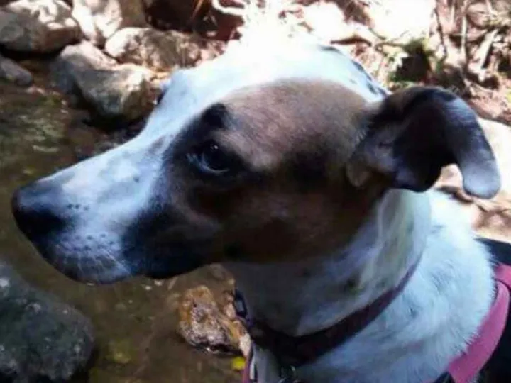 Porte medio. Pelagem curta. Branca com pintinhas escuras no lado esquerdo e orelha esquerda caidinha. Lado direito da face marron com orelha marron escuro e em pé. Mancha grande escura no lado direito do dorso quase na omoplata.