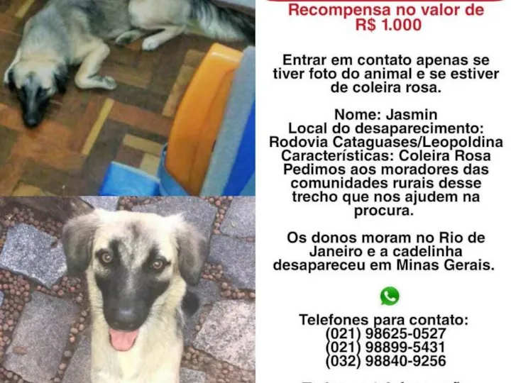 Jasmin se perdeu na estrada entre Cataguases e Leopoldina MG, ela tem 10 meses, muito docil e estava com coleira rosa.