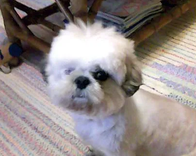 Ajude a encontrar Shin, o Shih Tzu branco, cego de um olho. Visto na Avenida Zumbi dos Palmares. Informações urgentes sobre o desaparecimento. Recompensa.