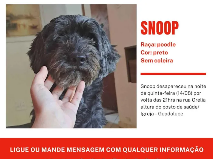 Snoppy, um cão macho da raça SRD-ViraLata, desapareceu na noite de 14 de agosto de 2025 em Guadalupe. Ele tem entre 7 e 11 meses, porte médio e pelagem preta. Caracteriza-se por ser vacinado, e mei...