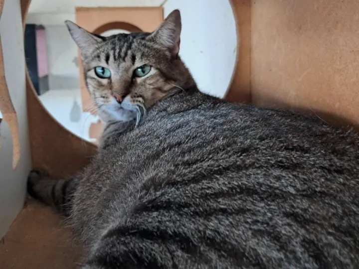 Hannah é uma belíssima gata tigrada de lindos olhos verdes. Castrada, testada para Fiv/Felv (negativa) e vacinada, tem temperamento muito dócil, embora seja ainda um pouco assustada. É carinhosa e meiga.