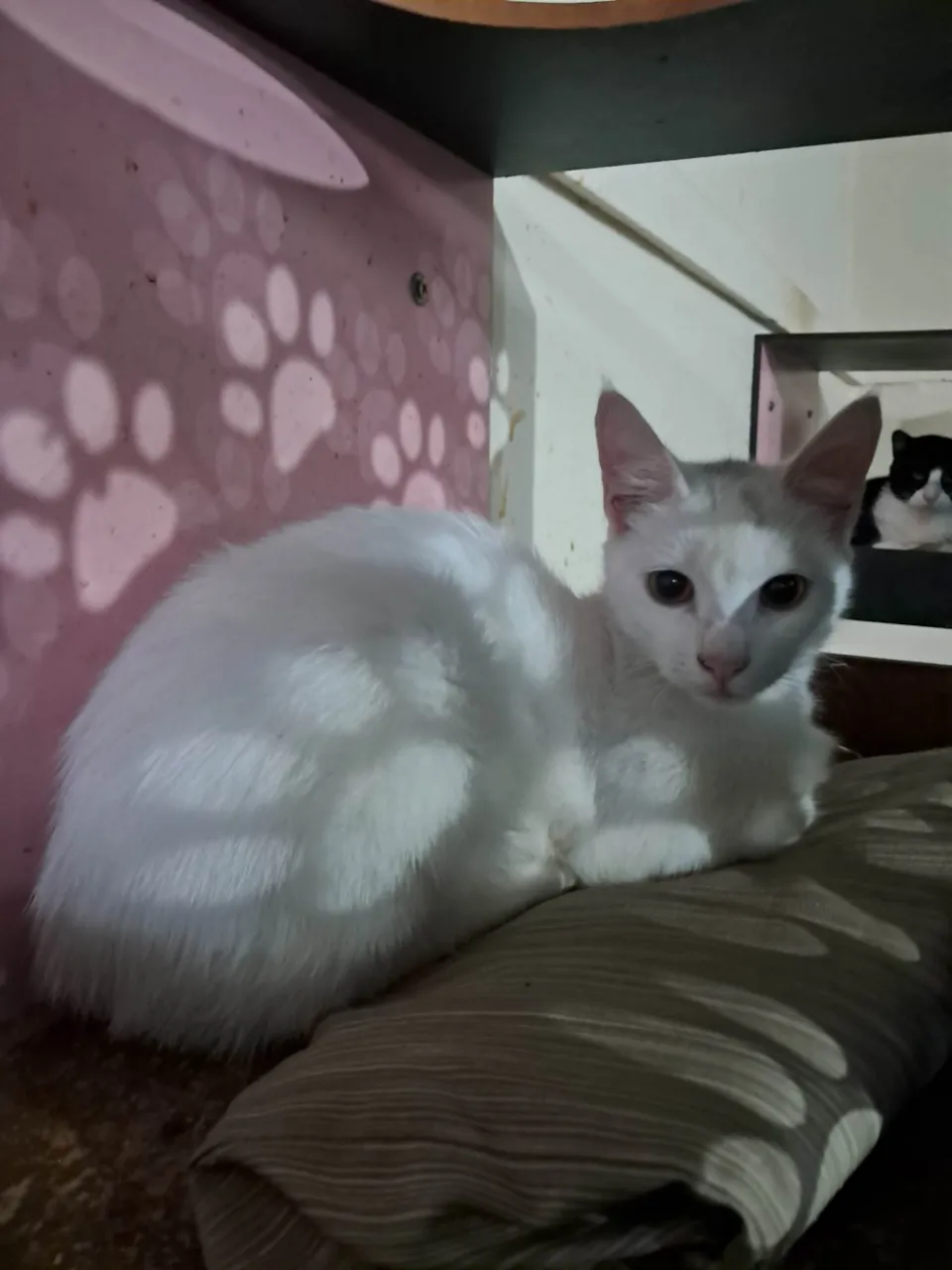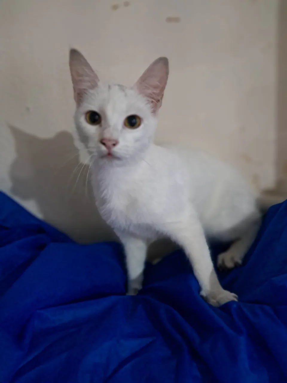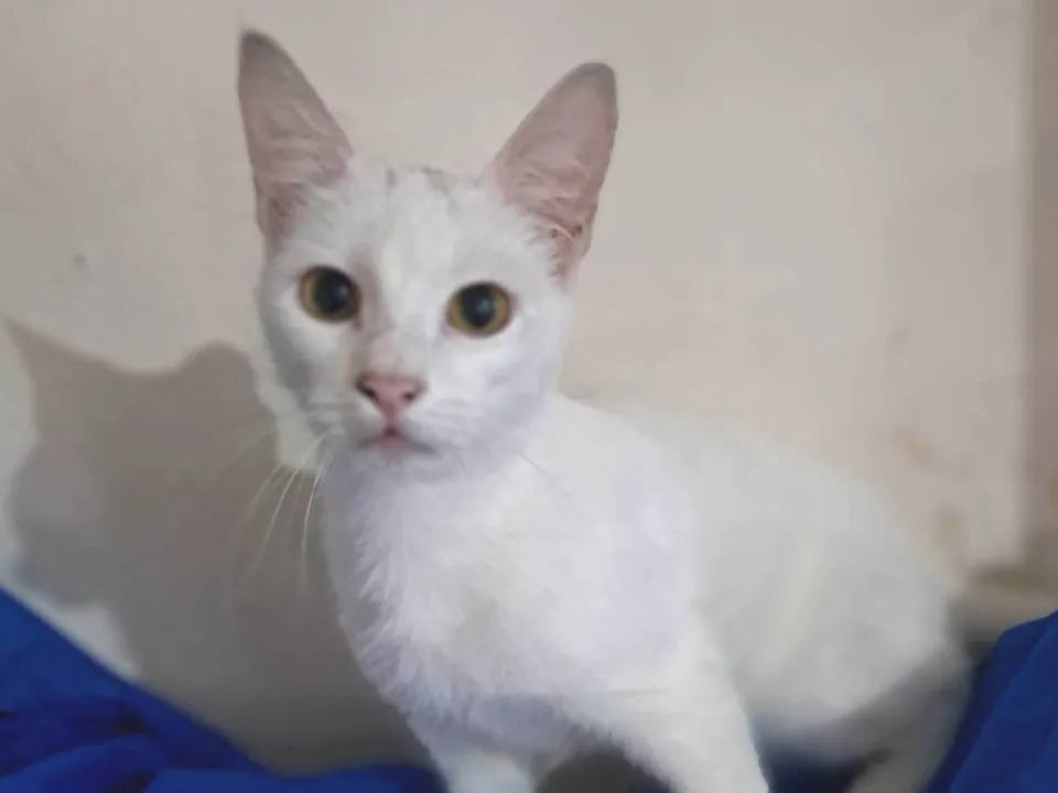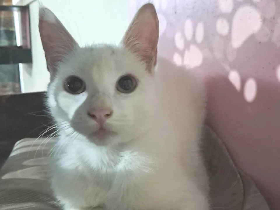 Rony é um lindo gatinho de aproximadamente 6,5 meses, de pelagem branca e uma pequena mecha preta na cabeça. Dócil e carinhoso, foi vermifugado, testado para Fiv/Felv (negativo), vacinado com a V5 e aguarda um lar cheio de amor para chamar de seu. Adoção somente para residências seguras, sem risco de fuga, com redes de proteção nas janelas ou varandas.