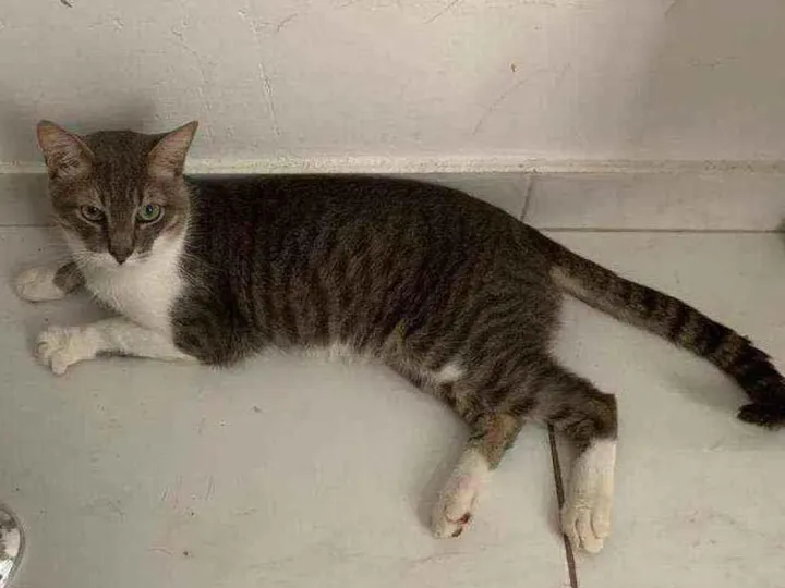 Macho, aproximadamente 1 ano e meio de idade. Foi resgatado da rua por nós. Estava desnutrido e muito debilitado, hoje se encontra saudável e bem espertinho. Já ganhou muitos kgs. Gato FELV+.