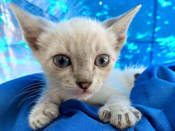 Branquinho/creme de olhos azuis e muita fofura! Come ração, usa caixa de areia e é super dócil e quietinho.