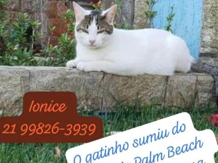 Gato de corpo branco, rabo e cabeça acinzentados e olhos amarelos. Dócil e está de coleira. Tem 1a e 7m. Atende pelo nome Kit. Desapareceu em Praia Seca, Araruama, no Rio de Janeiro.
