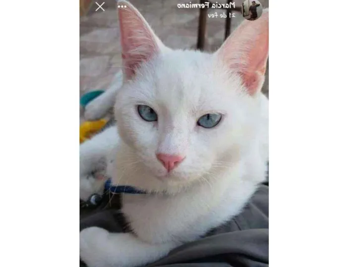 Olhos azuis e coleira vermelha com desenho de gatinho branco. Ele é assustado. Necessita de cuidados. É castrado.