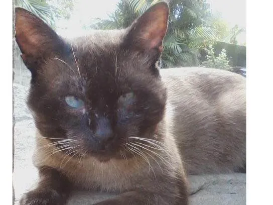 Marronzinho é um siamês de seis anos. Tem os pelos escuros e bochechas grandes. É magro, mas forte e grande. Ele precisa tomar remédio diariamente, caso contrário aparece feridas, principalmente em suas bochechas. Ele saia, mas não demorava a voltar. Estava do lado de fora de casa a última vez que o vi, no Carapiá, Guaratiba. Whats app +5521971057603