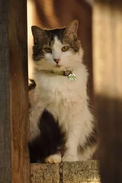 Cor e sinais particulares: Branco com costas e rabo preto e olho verde, coleira dourada amarela com ossinho