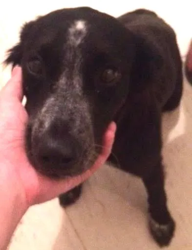Achei esta cadela na rua atrás do polo gastronômico de grussaí, não parecia estar perdida por muito tempo, bem limpa, é bem cuidada, muito dócil, pelagem preta com uma listra branca no fucinho e no peito, rabo cortado.