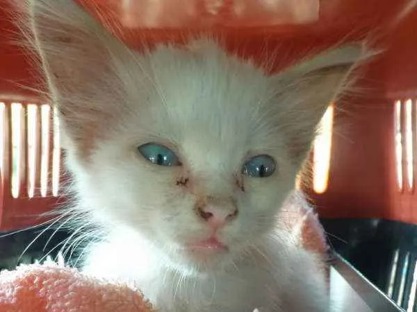 Doa-se gatinha branca com as extremidades acinzentadas e olhos azuis.