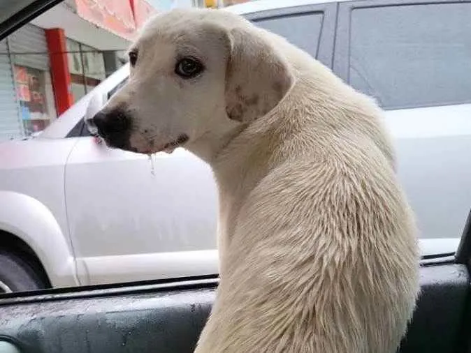 Encontrei um cachorro macho perdido na Serra de Guapimirim sentido Teresópolis, perto do Rogério Buffet e do antigo pastel serrano que agora está fechado. Entre o quilômetro 99 e o 100 da Serra de Guapimirim. Ele é dócil e entrou no carro assim que abri a porta.