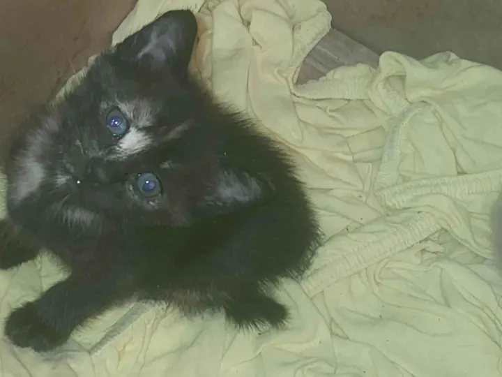 Adotei a mãe prenha, mas não tenho condições de ficar com os filhotes. Gatinha com manto preto, mas com cores branca e bege na barriga e patas e olhos azuis.