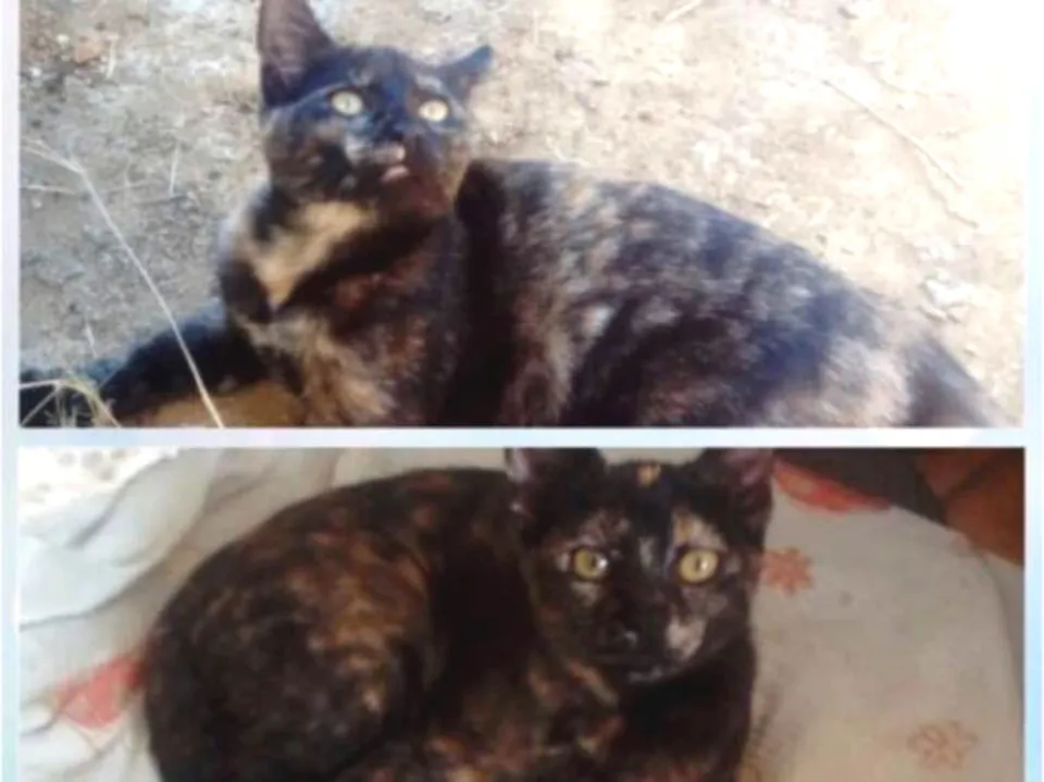 Uma de cor preta, olhos de cor amarela, pequena.