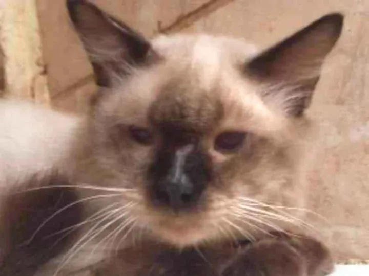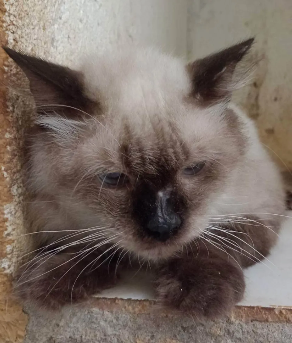 Gato castrado, branco com marrom e olhos azuis.