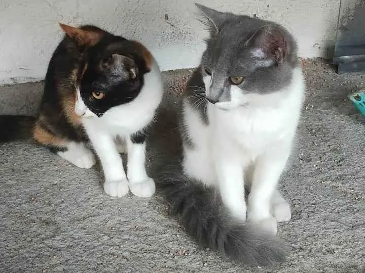 A gata é a que tem a pelagem tricolor chamamos ela de Cacau, ela é ativa e brincalhona e muito apegada ao irmão. Já o gato, a quem chamamos de Floquinho, tem a pelagem branca com manchas cinzas, ele é calmo e menos ativo que sua irmã, mas muito carente e gosta de colo, apego, e costuma dormir mais do que a Cacau. Amamos eles e não queremos deixá-los em qualquer lugar, arrincando a vida deles permitindo com que eles sejam propensos a pegar doenças, por isso estamos à procura de ONG's que possam cuidar bem deles