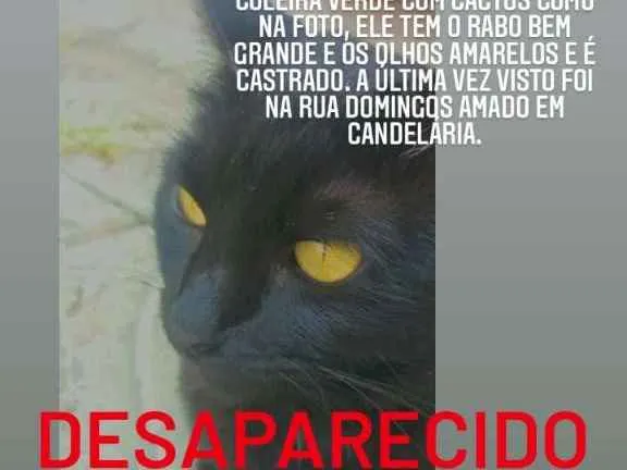 Ele atende se chamar por Dargor, tem 6 anos e ta com uma ferida na pata esquerda inteira, quando sumiu estava usando uma coleira Verde com cactos como na foto mostradai, ele tem o rabo bem grande e os olhos amarelos, a última vez visto foi na rua Domingos Amado em Candelária