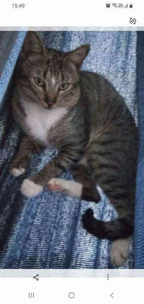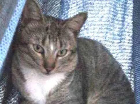 Um gato docio, manso, ele é cinza, ele é bem tranquilo, calmo, com um bom aspecto de saúde, ele se chama Tom a cor dos olhos e verde