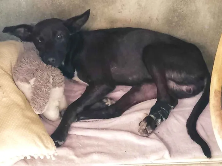 Ela atende pelo nome pretinha, a pata dela ta fraturada, sem osso aparecendo, a ferida q tava já tá cicatrizando, o dedo tá deslocado nn sei, é muito brincalhona