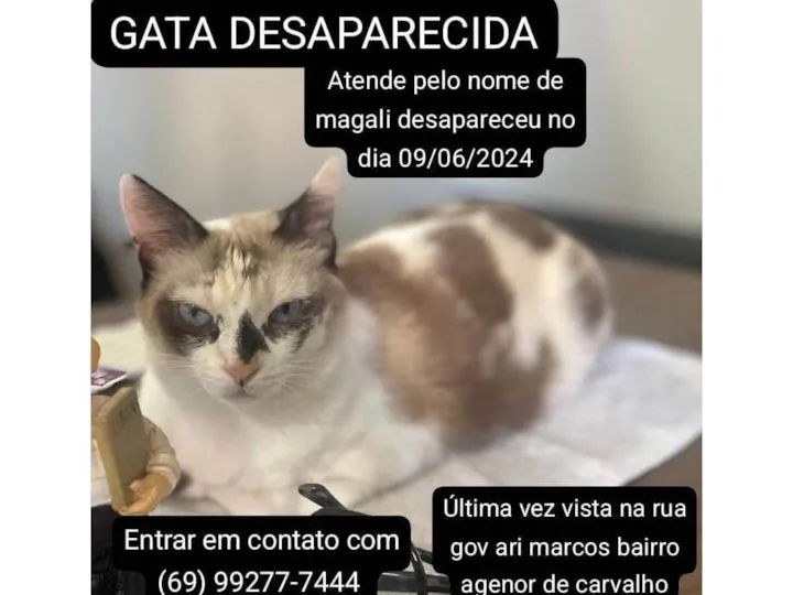 Estamos à procura de uma gatinha que atende pelo nome de magali Ela tem pelagem branca com manchas cinza, dois anos de idade, porte médio e é castrada. É um animal muito dócil, sociável com crianças, adultos e idosos, e se adapta bem a casas com quintal. Ela é uma companheira querida e sua ausência tem sido profundamente sentida por nossa família.